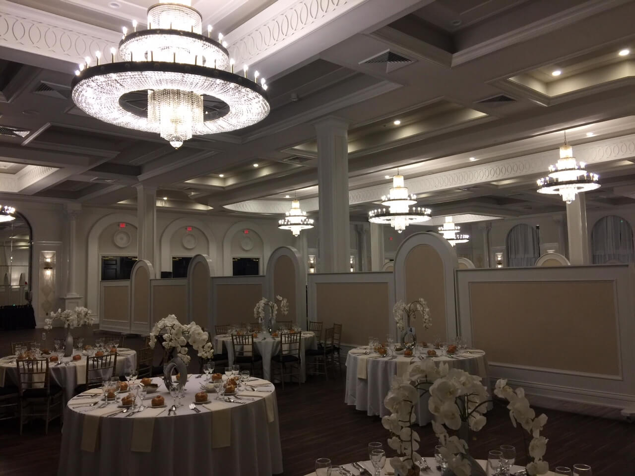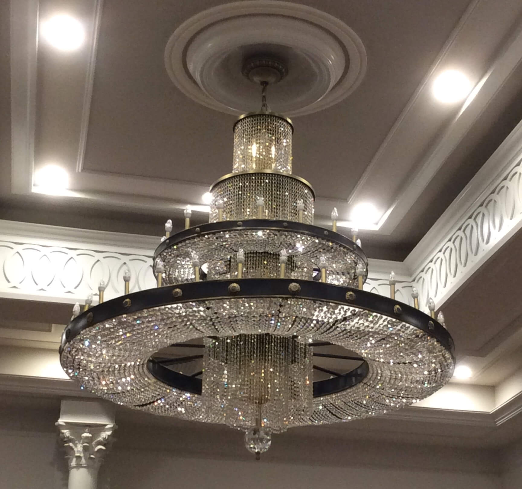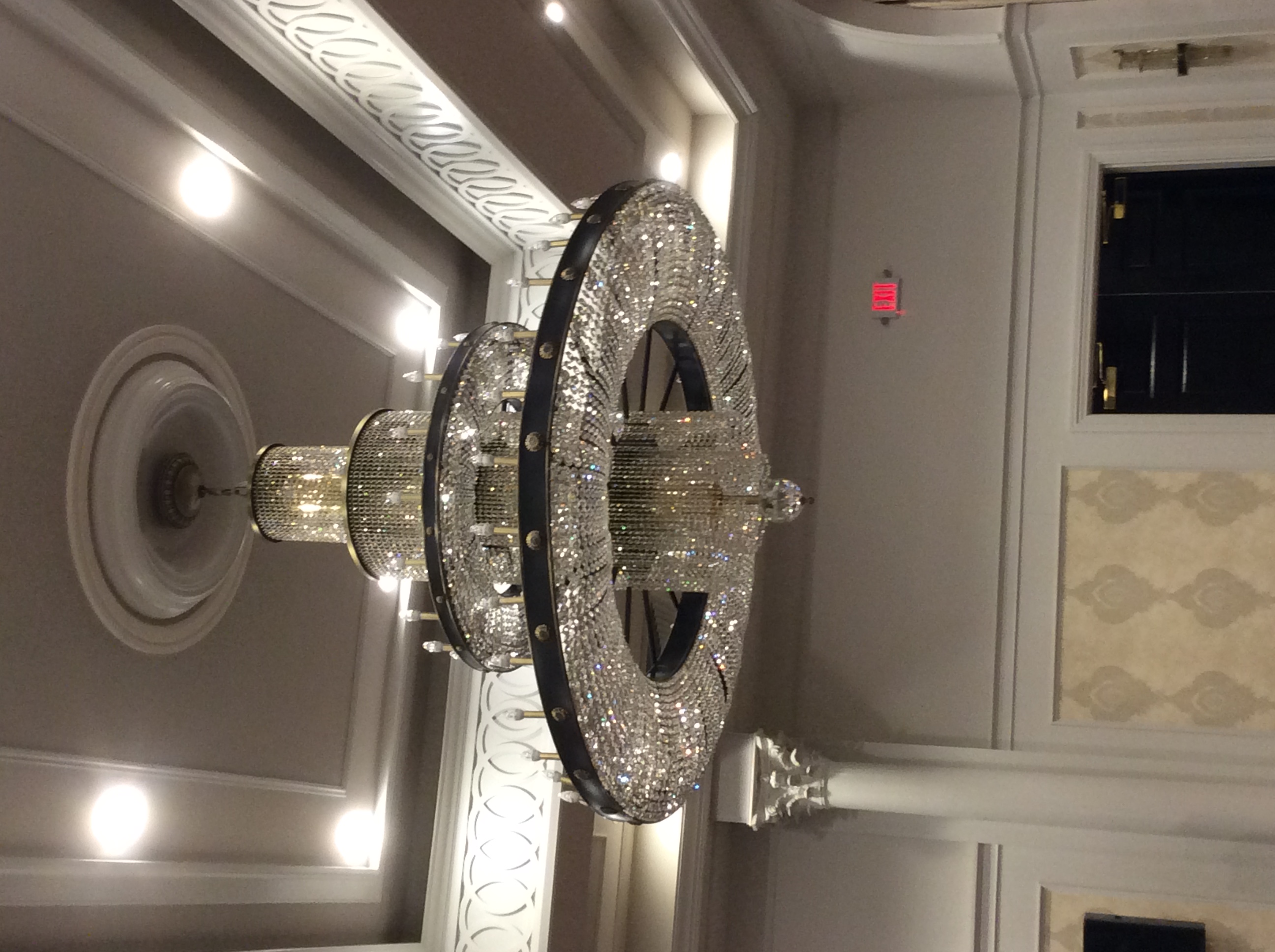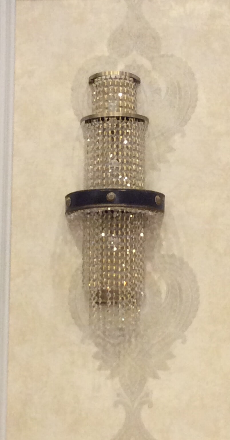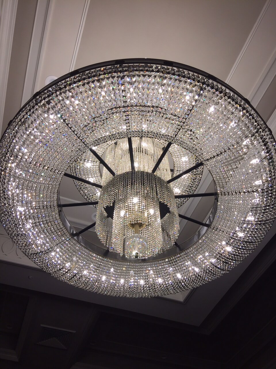 Description:The chandeliers are a mix of Modern and Classical European style and are made up of 2 central columns of crystal surrounded by 2 outer rings. The matching wall mounts around the room complete the stunning effect.