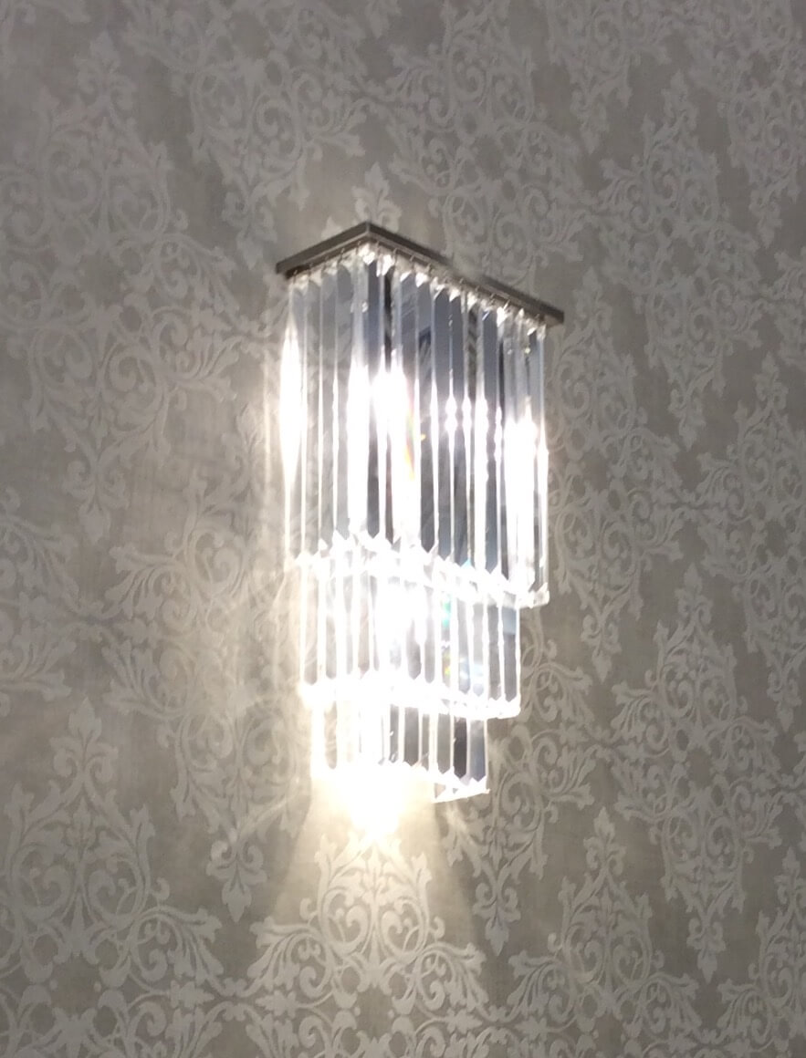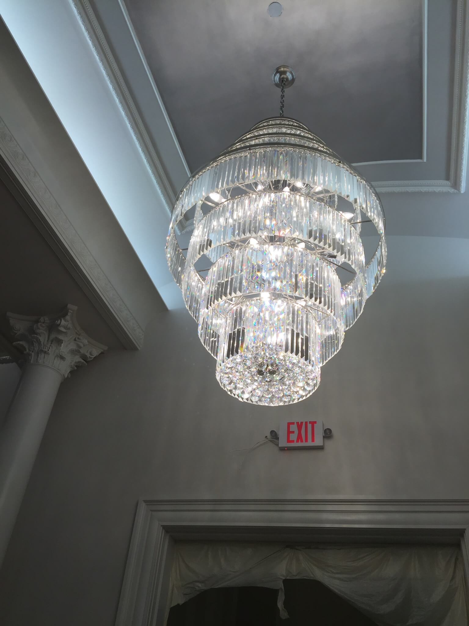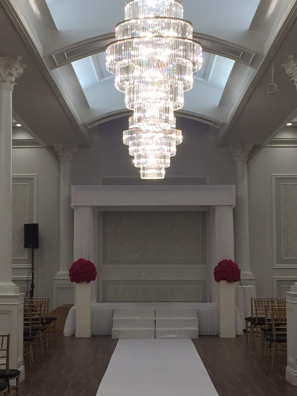 Exquisite 7 tier chandeliers of faceted crystal create a sparkling light effect around the room.