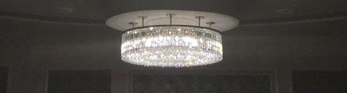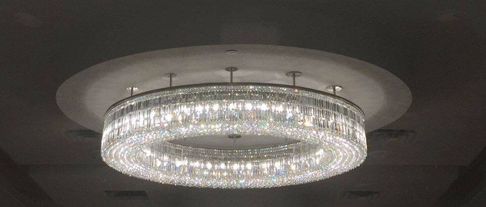 • Description: A beautiful 84"diameter crystal ring chandelier, flanked on either side by 2 smaller 36" diameter ring chandeliers.