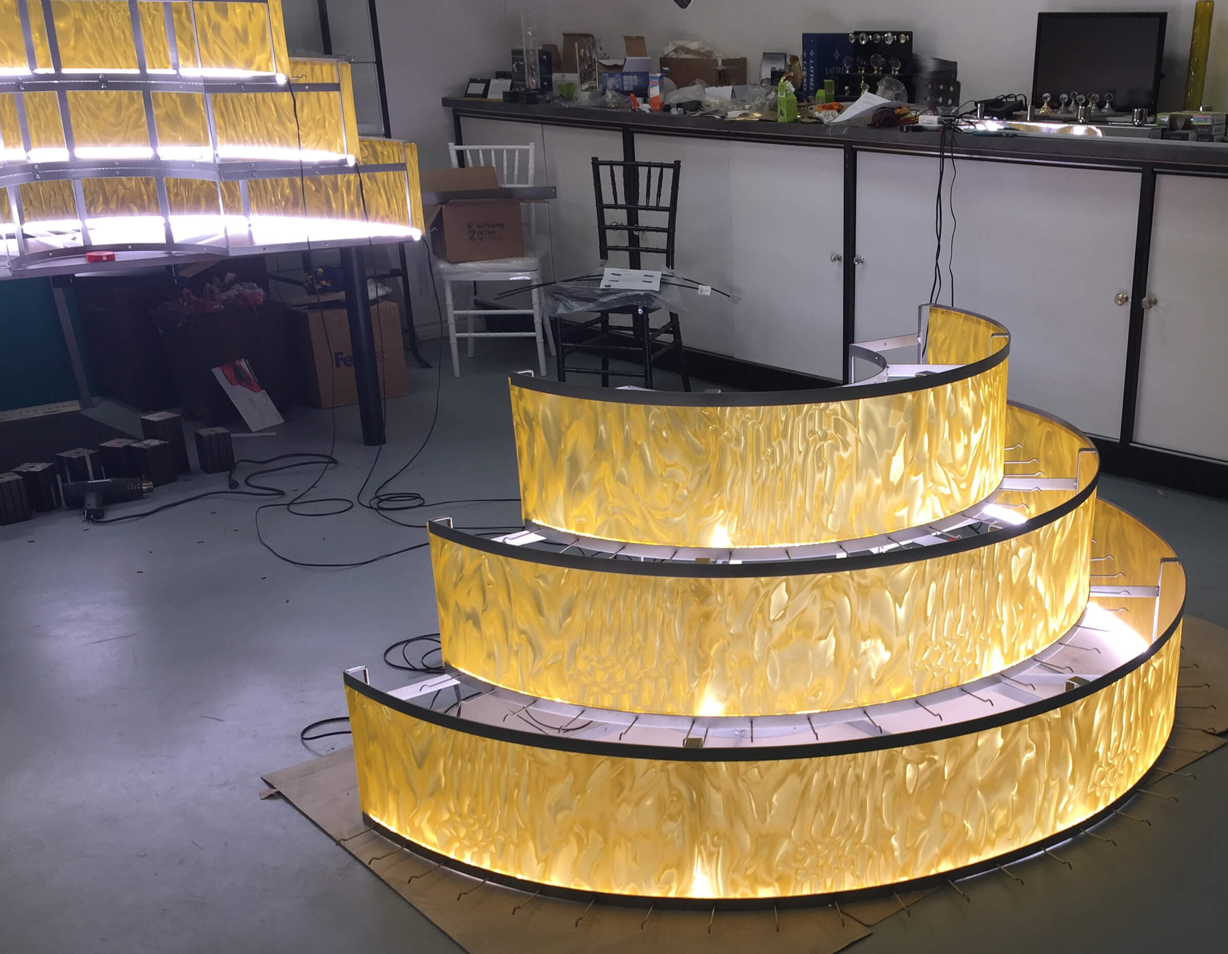 3 rings of egg yolk coloured patterned vinyl on a EP Painted steel frame lit with double LED strips.