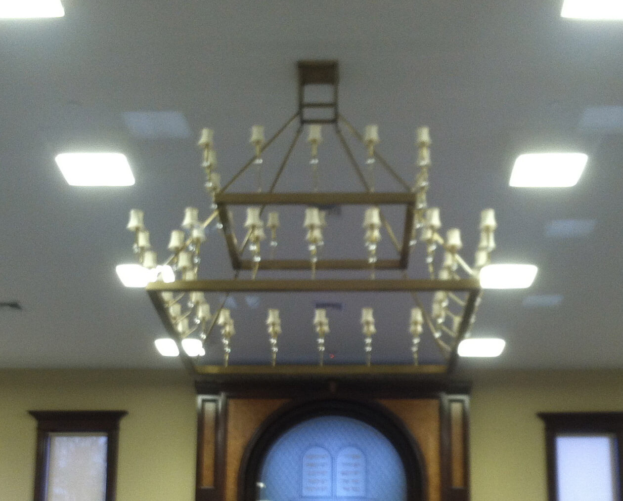 Square 2 tier chandelier tapering to a triangular top; Finished in Antique Brass with crystal accents and topped with silk shades