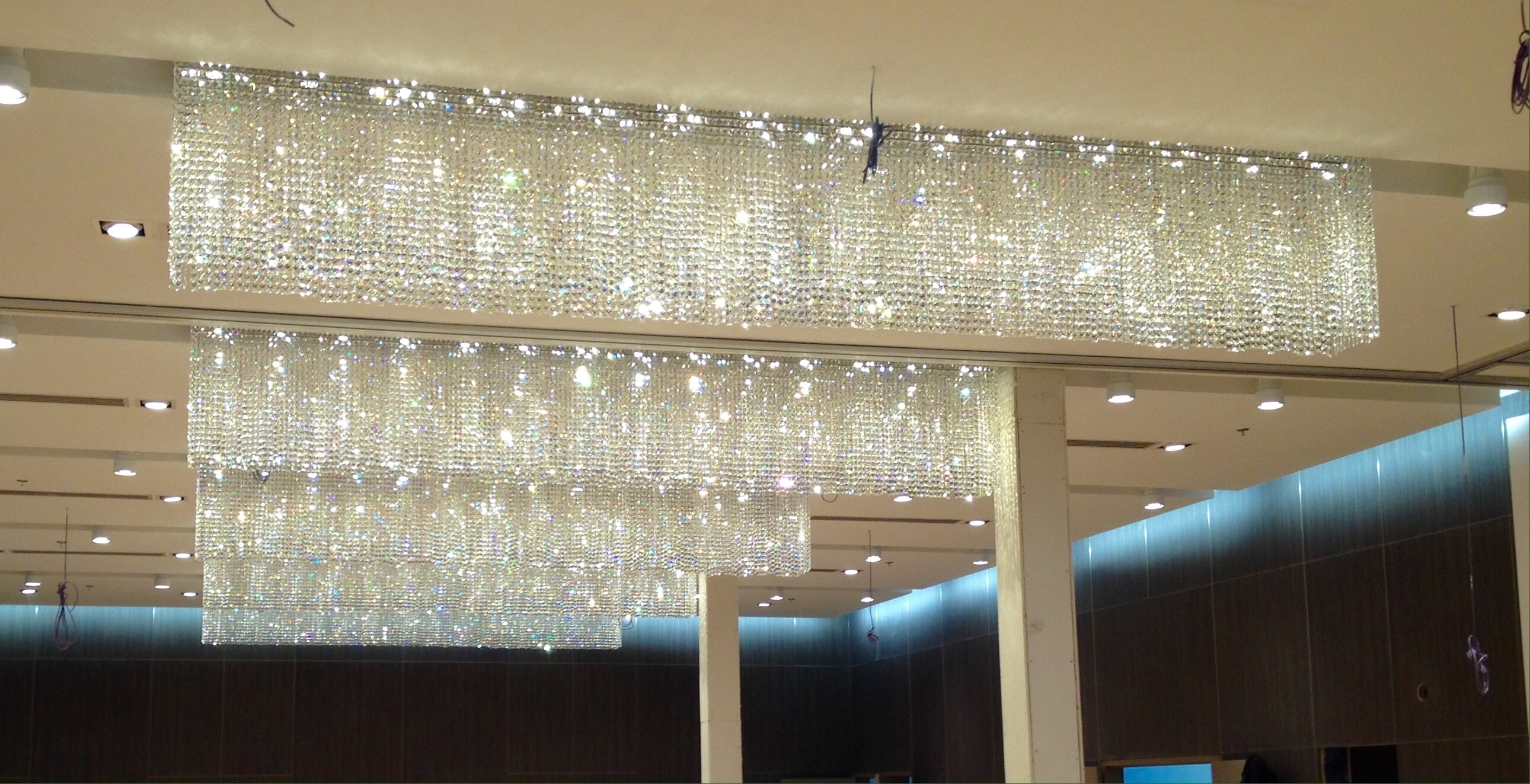 12 foot long chandeliers with 30" strands of sparkling square crystal strings hanging all around the edges.