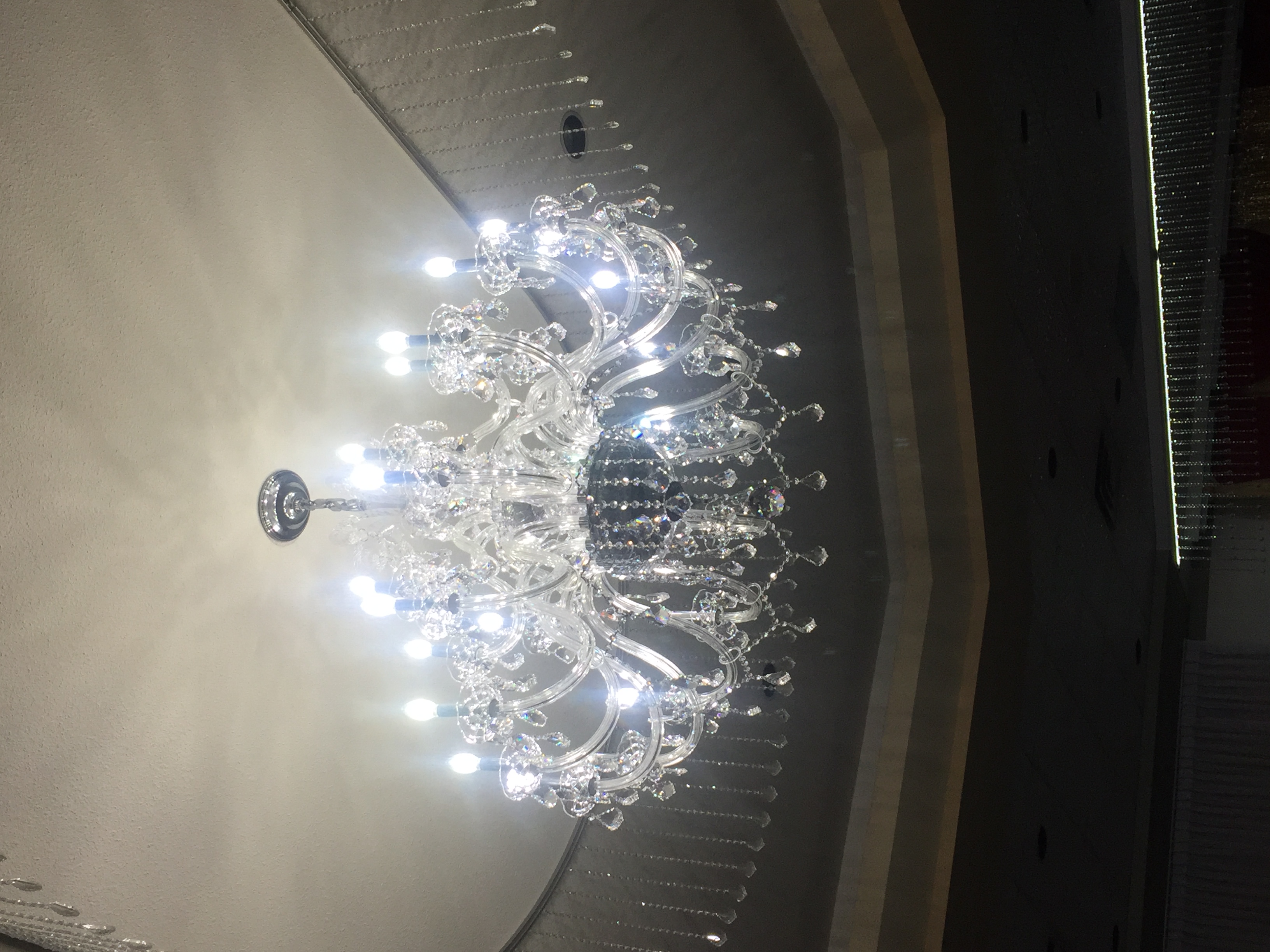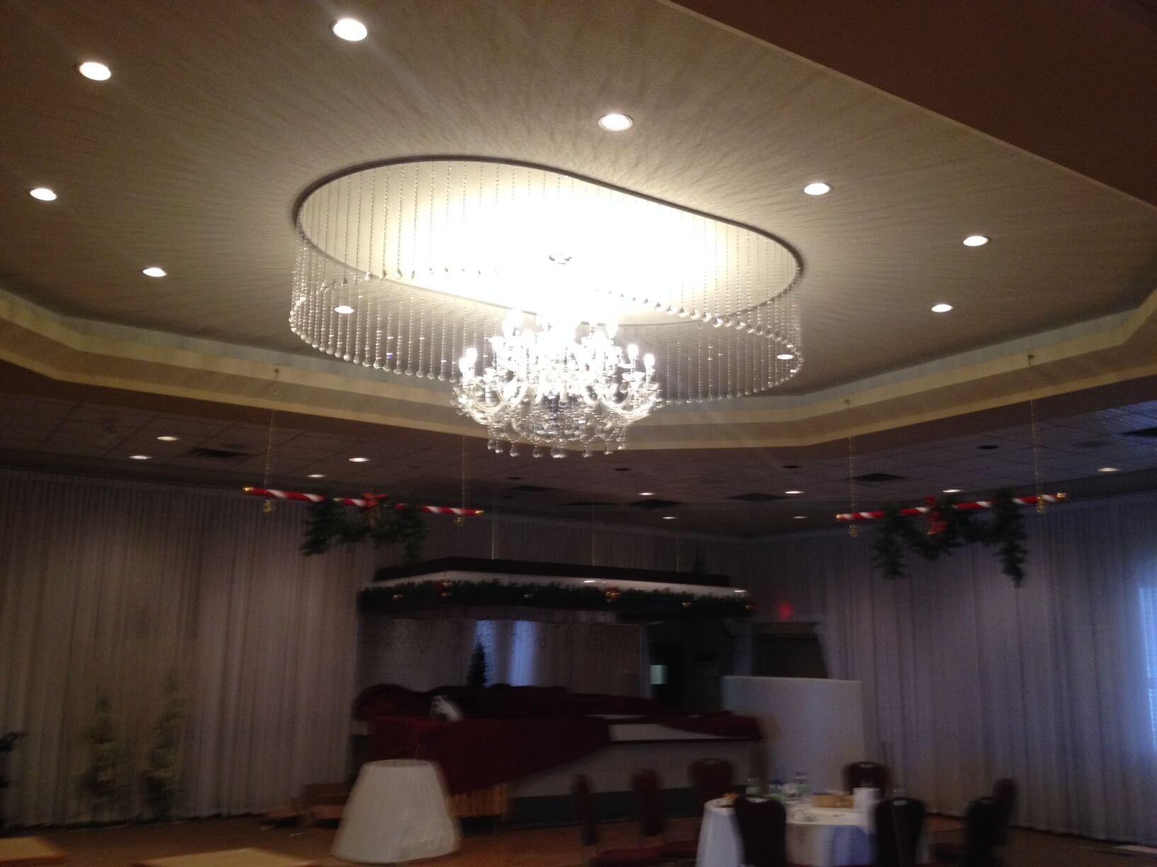 • Description: 2 crystal chandeliers each surrounded by an oval ring of hanging crystal strands and between them is a runway of hanging crystals with LED lighting in the centre leading the way to the head table. Beautiful!