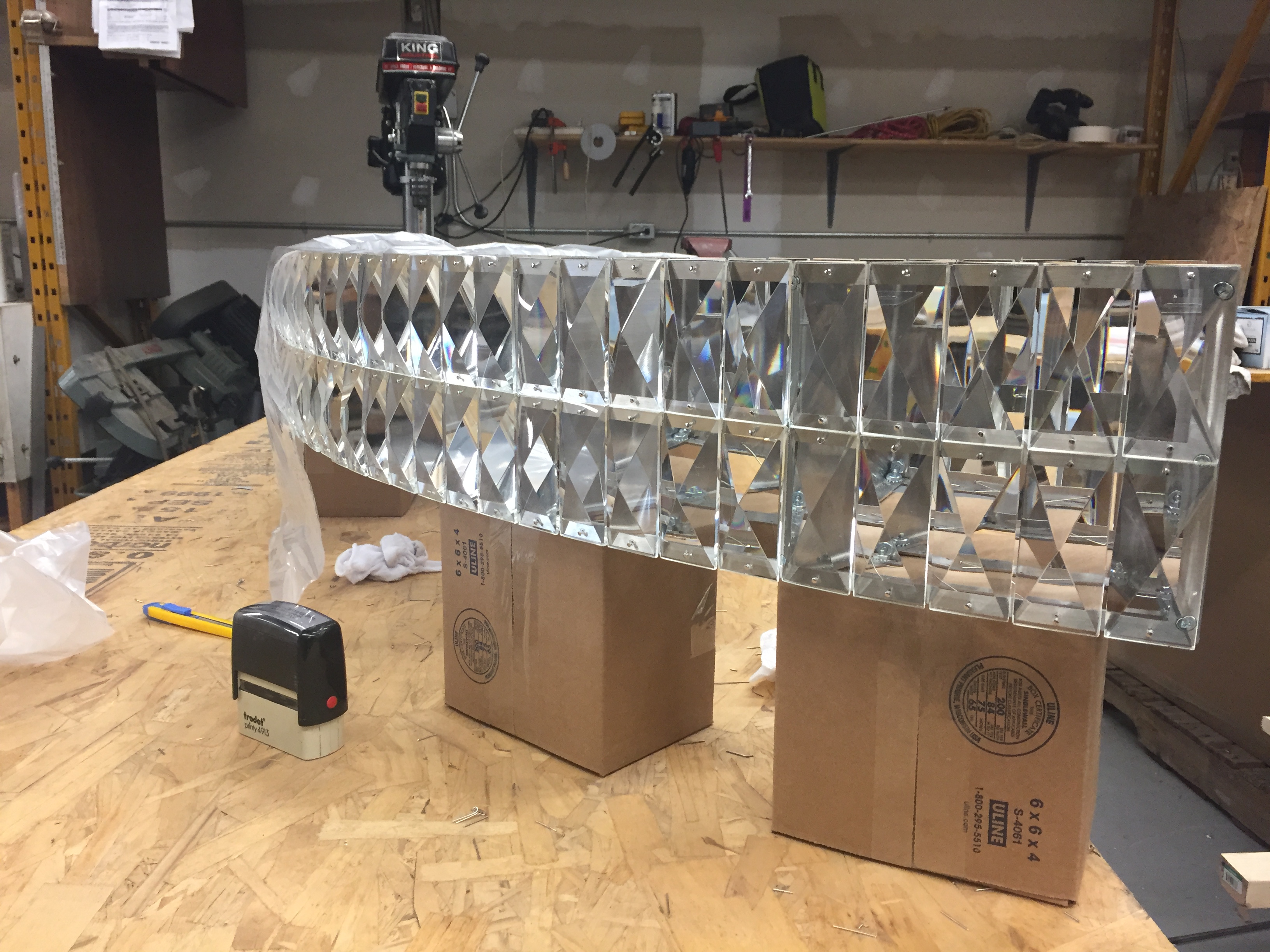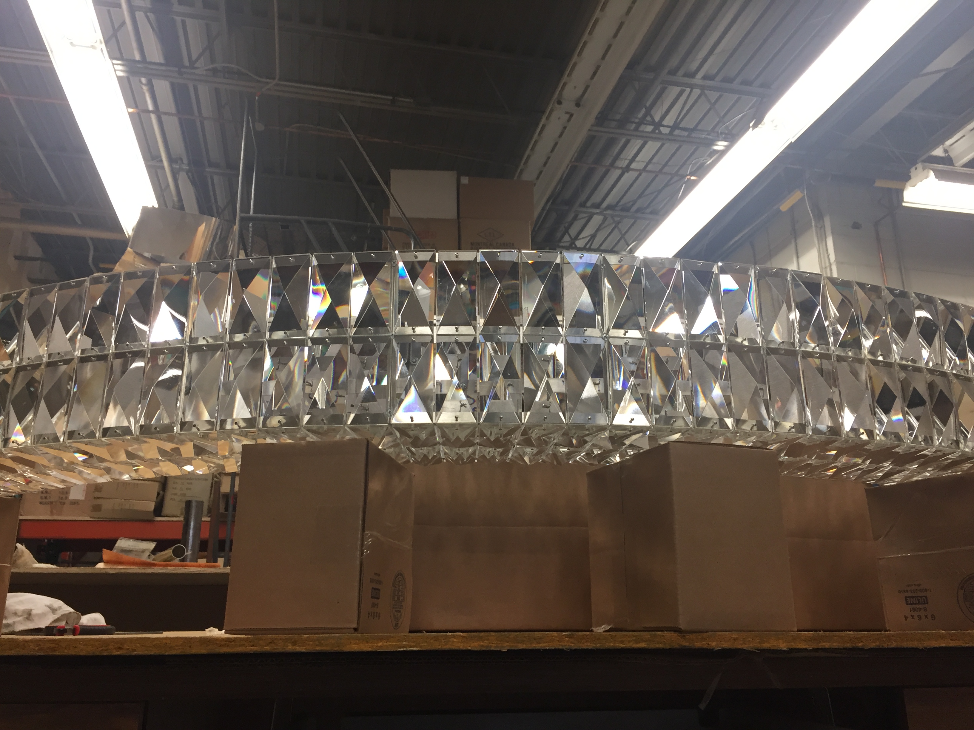 Description:A group of 3 stunning chandeliers. The center chandelier has a middle ring 10 feet in diameter as well as a 7 foot ring on top and another on the bottom. This fixture is hangs between two 8 foot ring chandeliers. Each ring is made with faceted rectangular crystals that were custom ordered to fit together together, like pie pieces, tapering towards the center of each circle, and adjusted to the diameter of each ring.