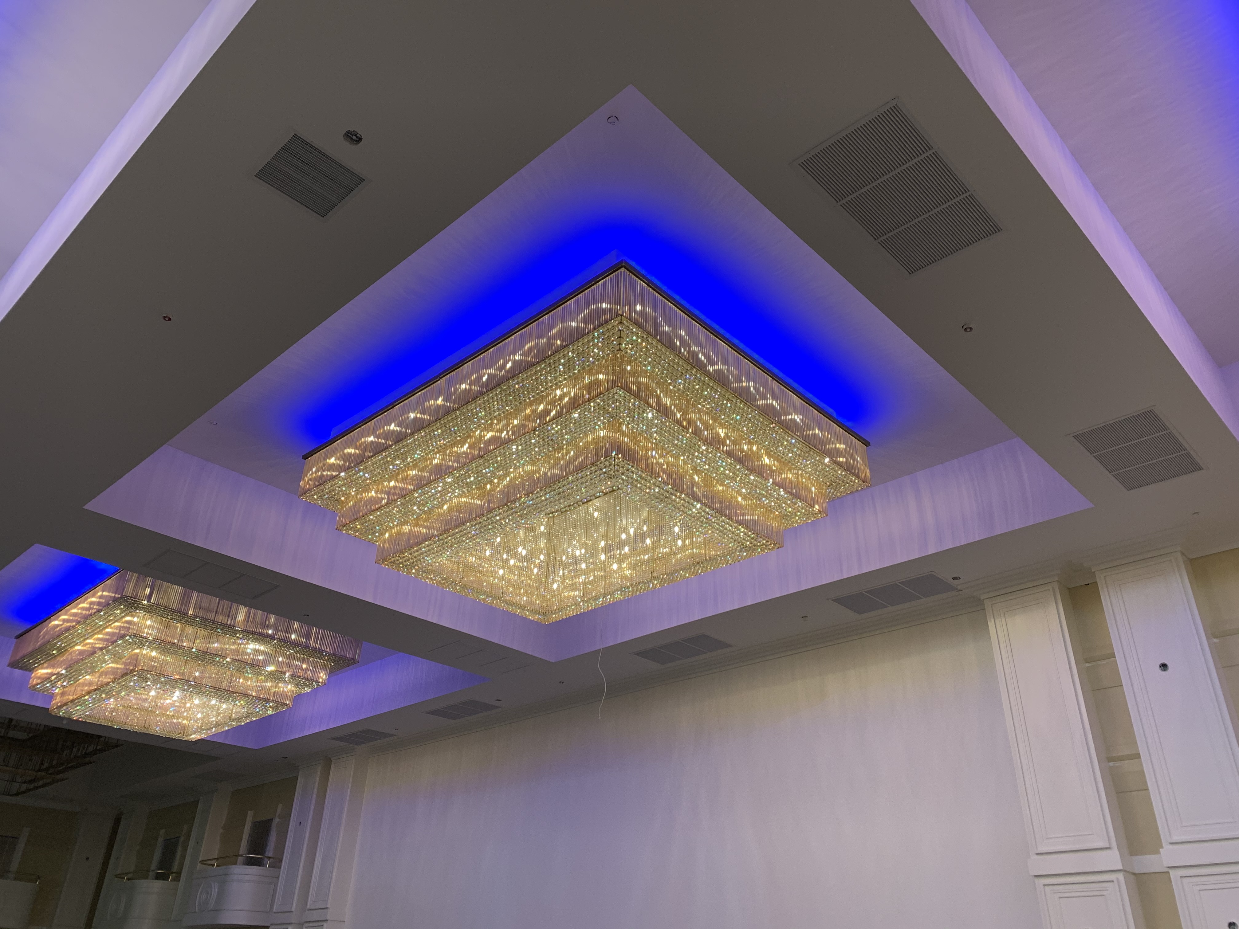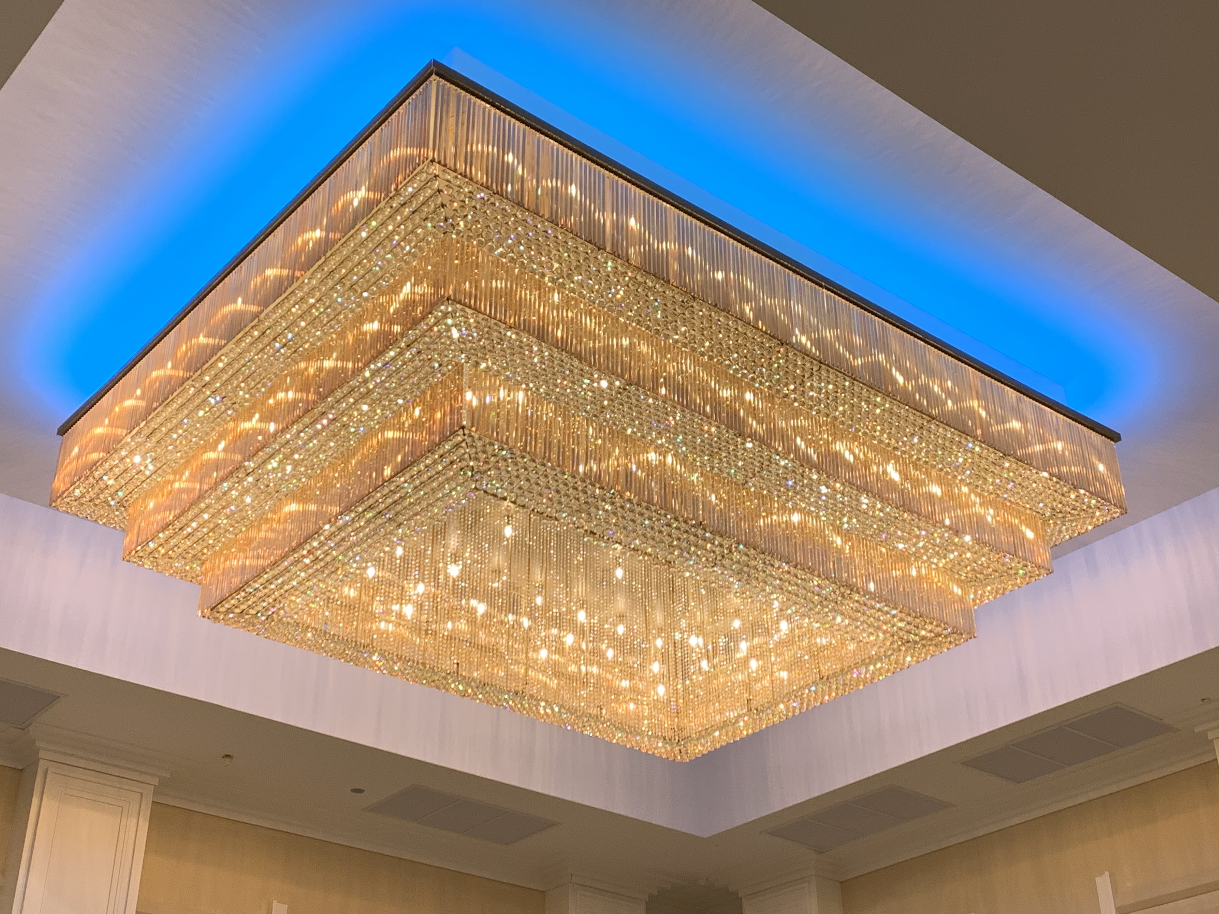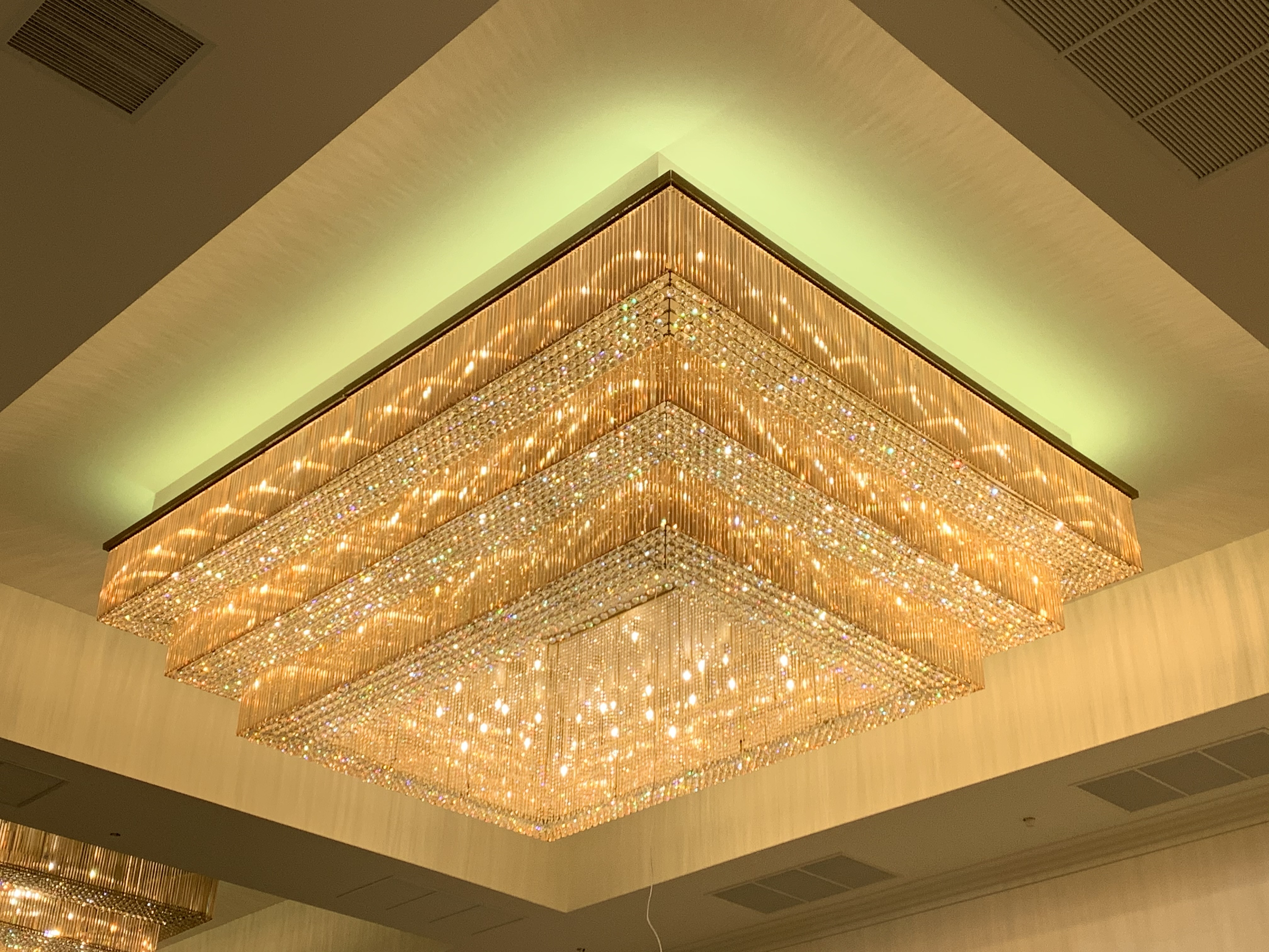 Description:16 stunning fixtures were created to fit in the recessed boxes of the ceiling. Each 11 ft. x 14 ft chandelier has long faceted amber coloured crystal rods along the outside perimeter of each tier, along with clear crystal spheres filling in the bottom of each step, angling downward toward the center. Each one has a colour changable LED strip all around the top of the chandelier, so the lighting can be customized to suit the occasion.