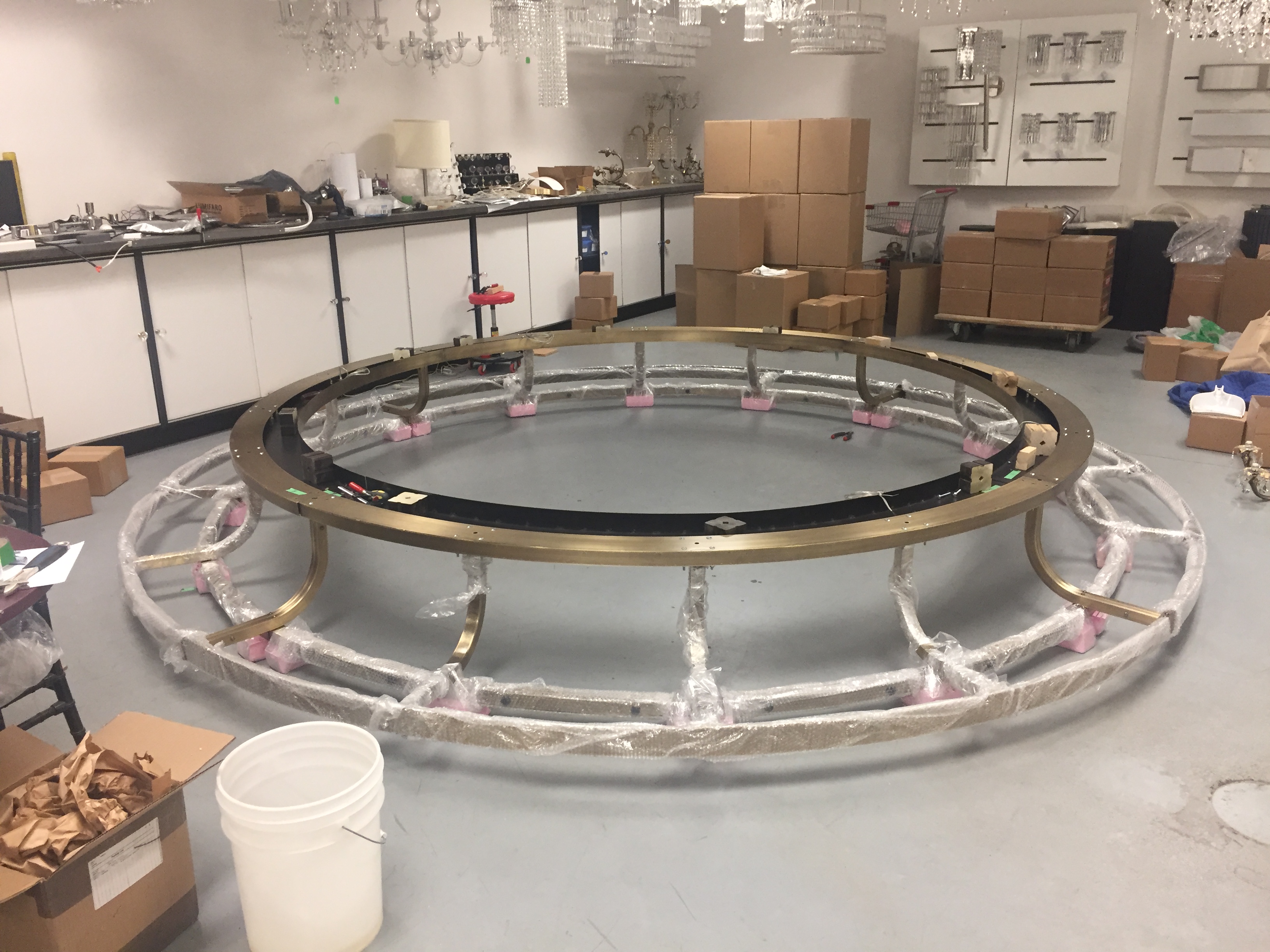 • Description: Massive 13-1/2 ft. diameter crystal ring chandelier, with colour changing LED to light up the dome in the middle.